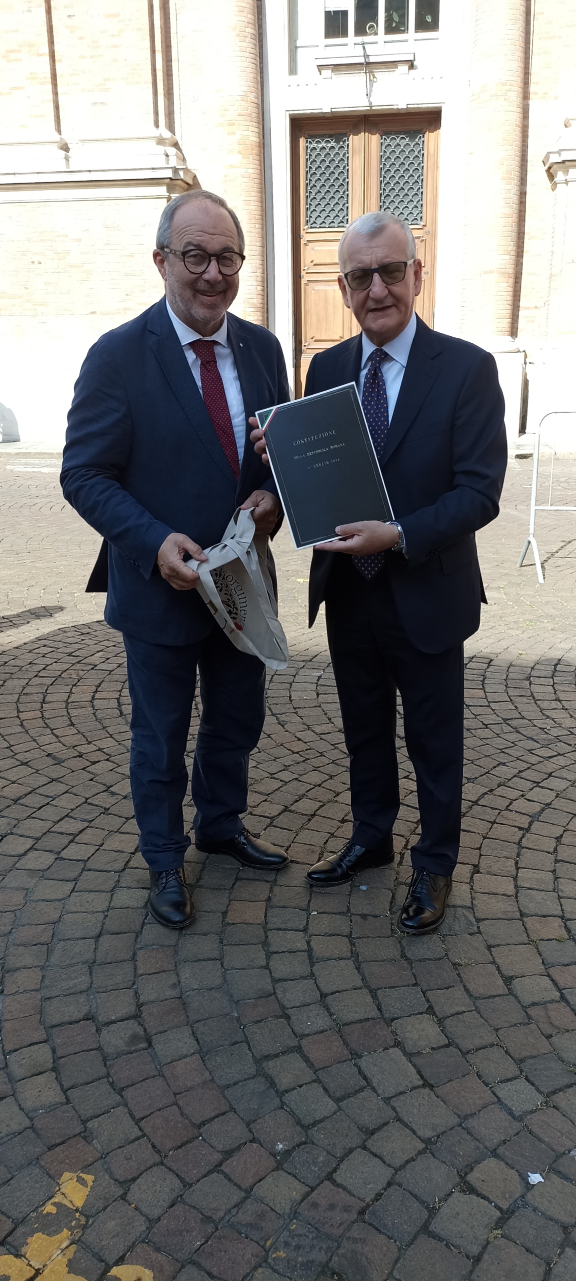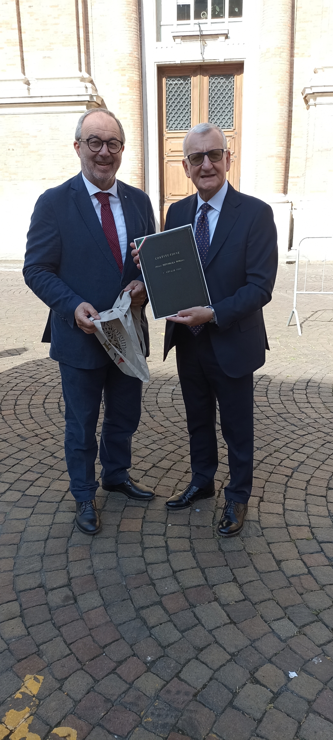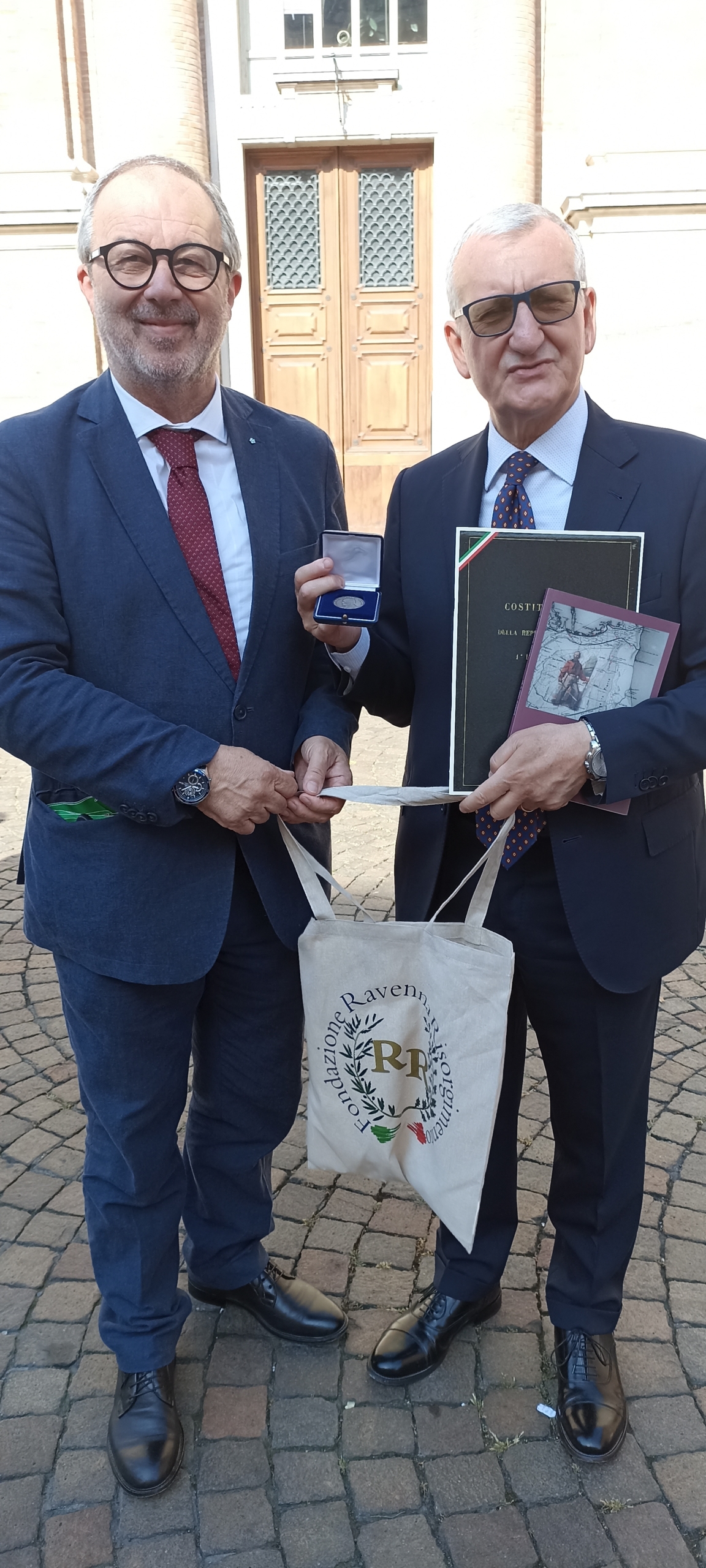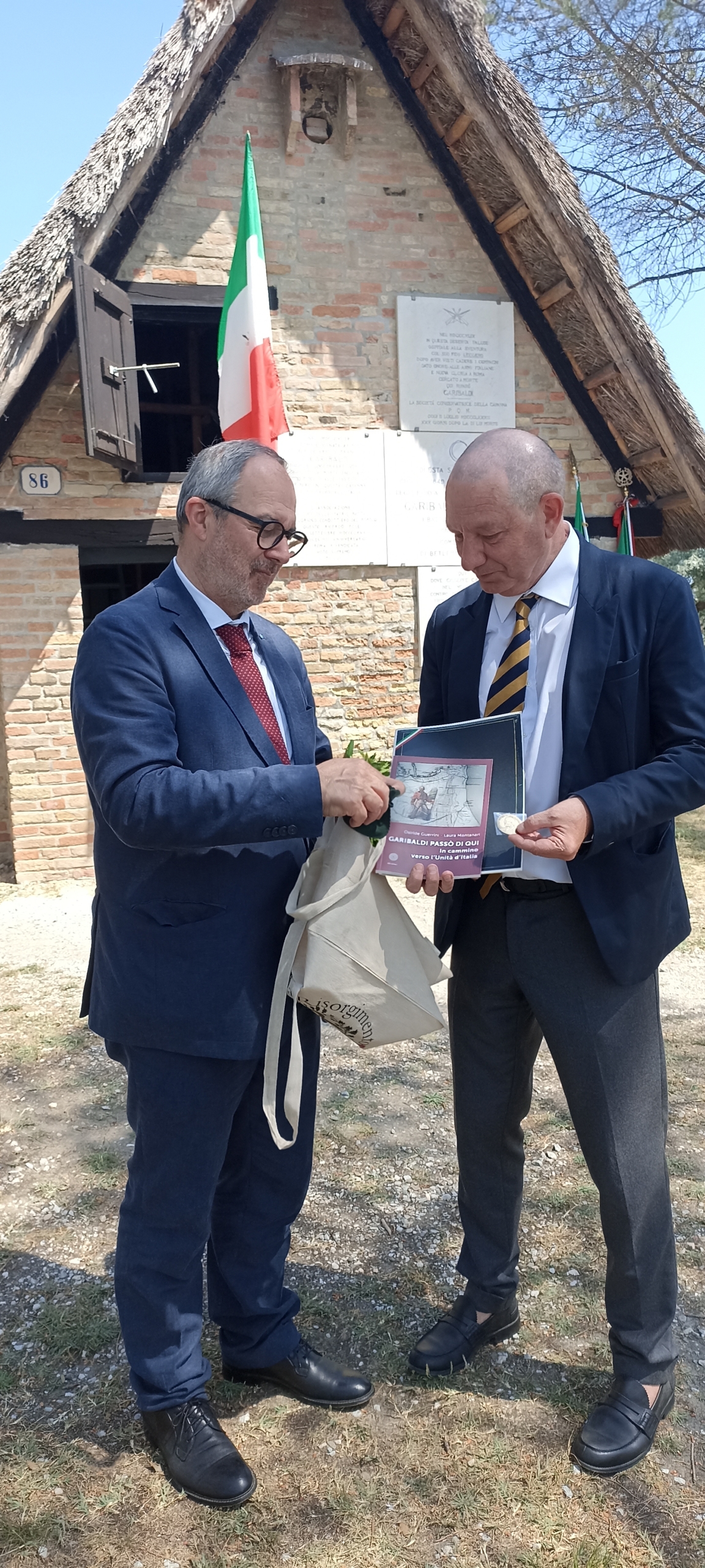 Dopo la deposizione delle corone, le prolusioni e l’esibizione della banda cittadina Eugenio Fusignani ha donato al nuovo Prefetto di Ravenna una copia della ristampa facsimilare della versione manoscritta della Costituzione della Repubblica Romana del 1849, una copia del volume Garibaldi passò di qui, che narra le vicende della Trafila garibaldina, e la medaglia realizzata in occasione dei 150 anni dalla morte di Giuseppe Mazzini.
